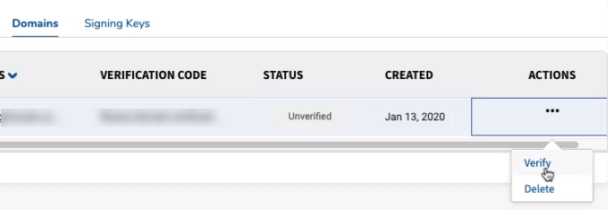 In the domain’s corresponding Actions column, click the ellipses (...) and then click Verify.