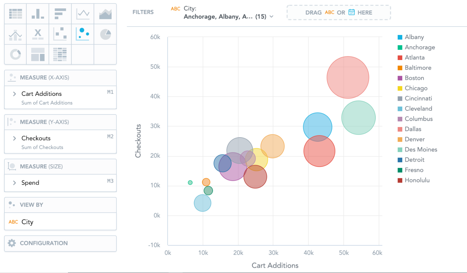 Bubble charts are similar to Scatter plots. They show data points as bubbles using Cartesian coordinates. In addition, bubble charts can display the size of the bubbles in proportions using a third measure. If you add an attribute to the View by section, the bubbles get different colors for each attribute value.