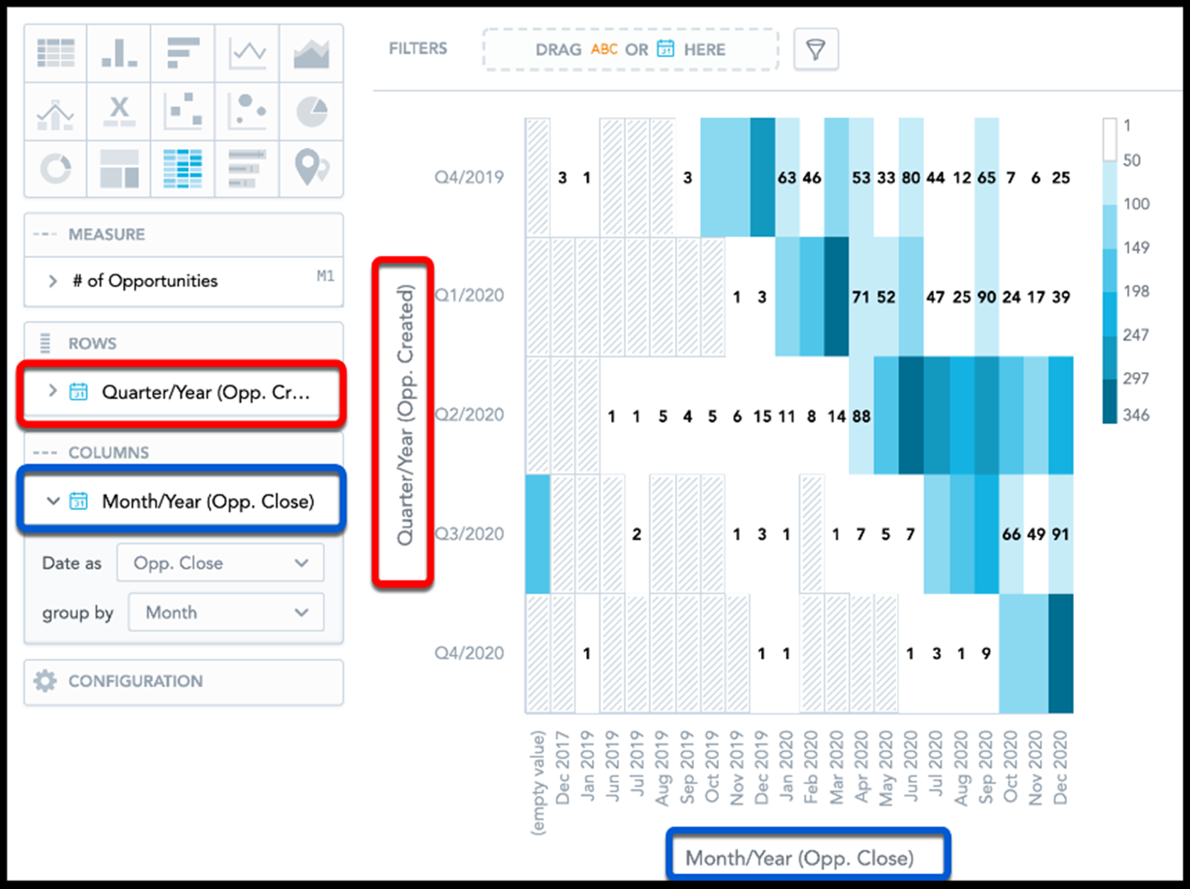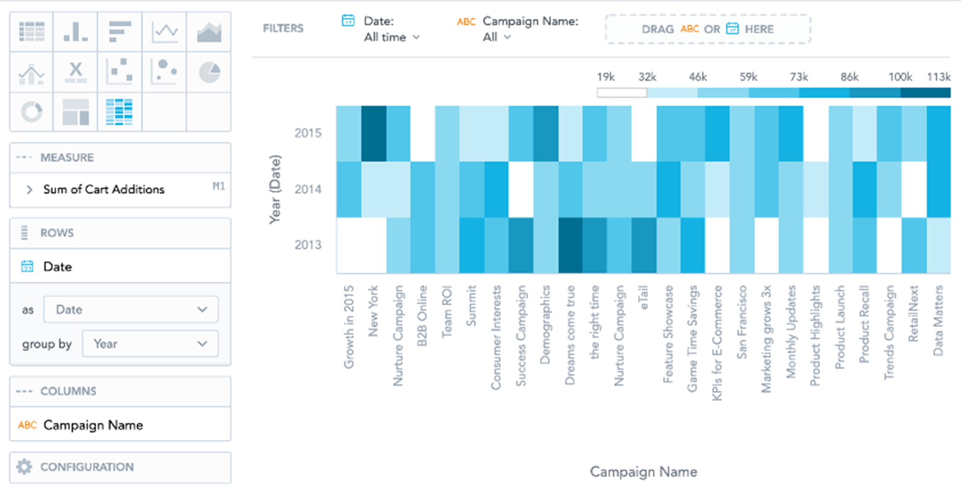 Heatmaps have the following sections: Measure, Rows, Columns, and Configuration.