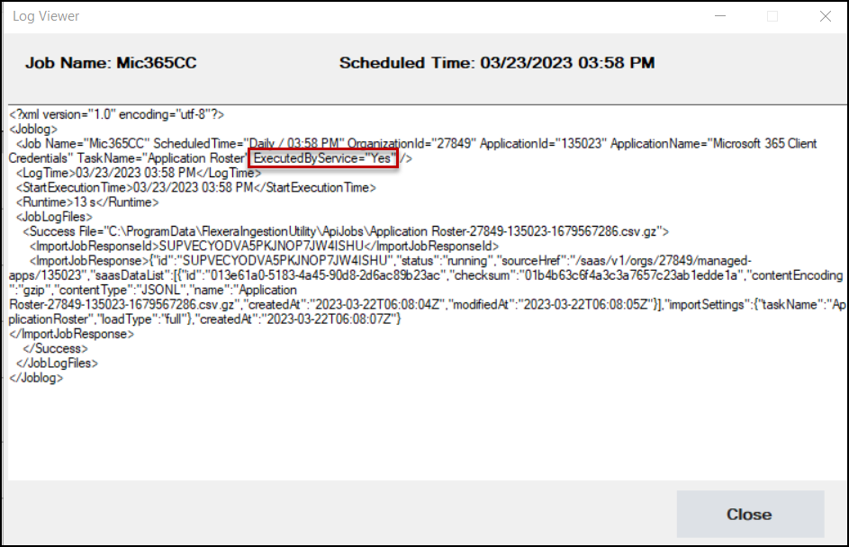 If you selected the Advanced installation option in Installing FSM Data Ingestion Utility to run FSM Data Ingestion Utility as a Windows Service, the Job Log information displays the XML attribute ExecutedbyService=“Yes” next to the TaskName. For details, see the red box in the following screenshot.