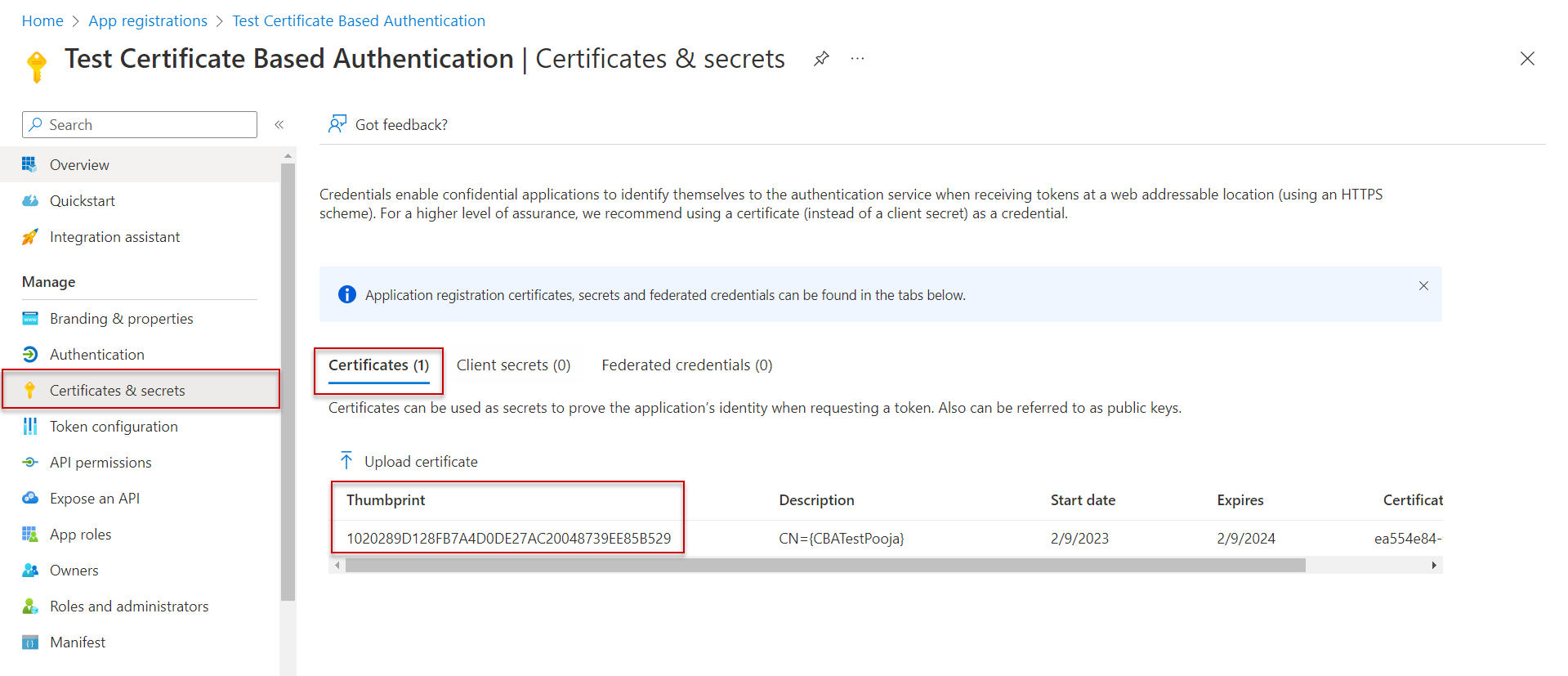 After executing the commands in steps 8a to 8c, in the Microsoft Azure Portal go to the App Registrations page. From the left-hand navigation under the Manage menu, click Certificates & Secrets. Go to the Certificates tab and click Upload Certificate to upload the certificate (